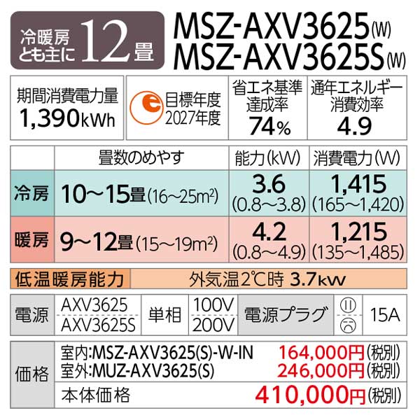 ◆15時迄出荷OK!三菱 ルームエアコン【MSZ-AXV3625S W】ピュアホワイト 2025年 AXVシリーズ 霧ヶ峰 単相200V 主に12畳用 (旧品番 MSZ-AXV3624S W)