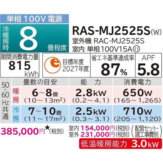 日立 ルームエアコン【RAS-MJ2525S W】スターホワイト 2025年 MJシリーズ 白くまくん 単相100V 8畳程度 (旧品番 RAS-MJ25R W)