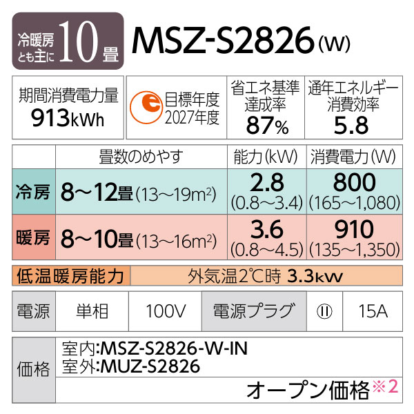 ω三菱 ルームエアコン【MSZ-S2826 W】ピュアホワイト 2026年 Sシリーズ 霧ヶ峰 単相100V 主に10畳用 (旧品番 MSZ-S2825 W)